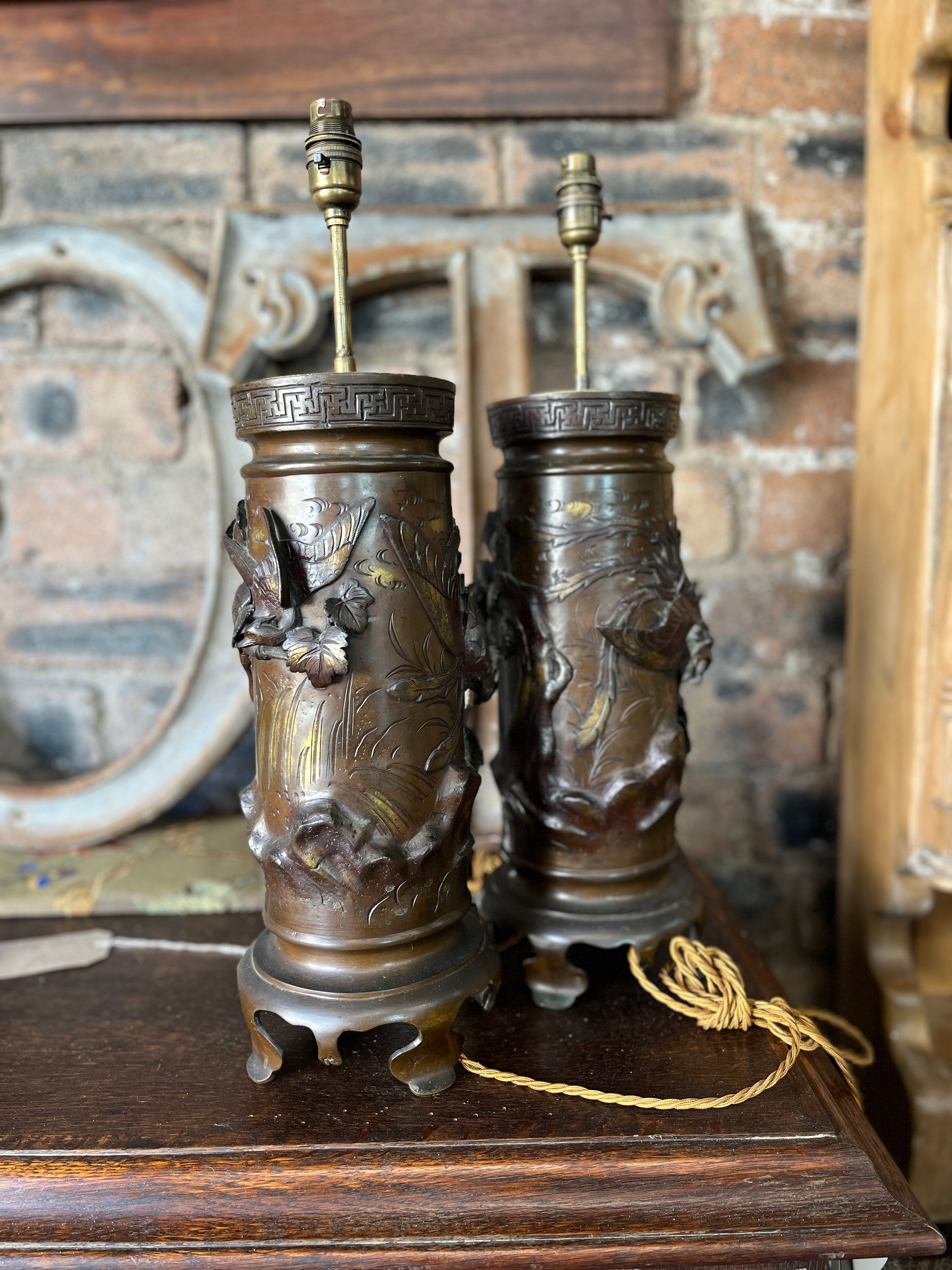 This 19th century bronze vessel lampshade from the Meiji period (1868–1912) represents a refined piece of Japanese decorative art, featuring detailed nature-inspired carvings.