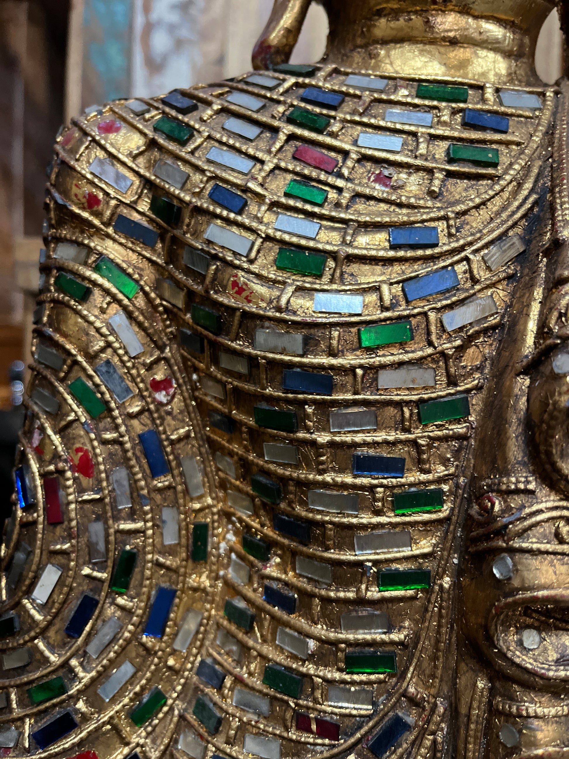 This large Burmese Buddha statue measures 45 inches in height and 18.5 inches in width, showcasing detailed carving that highlights traditional craftsmanship. The sculpture is accented with beautiful coloured jewels, adding a vibrant and refined touch. Ideal for enhancing spiritual spaces or as a distinguished decorative piece, it embodies both artistic mastery and cultural significance.