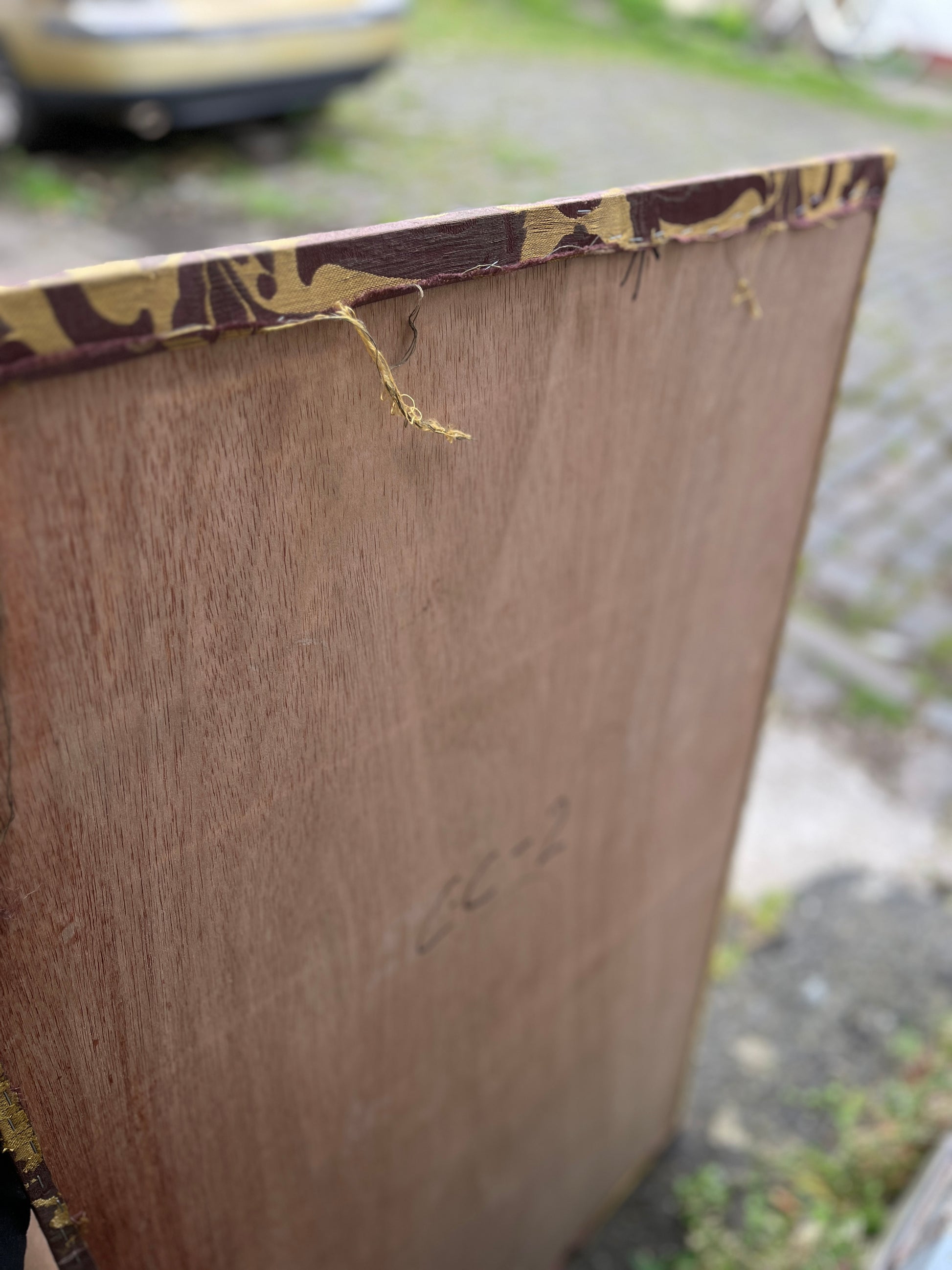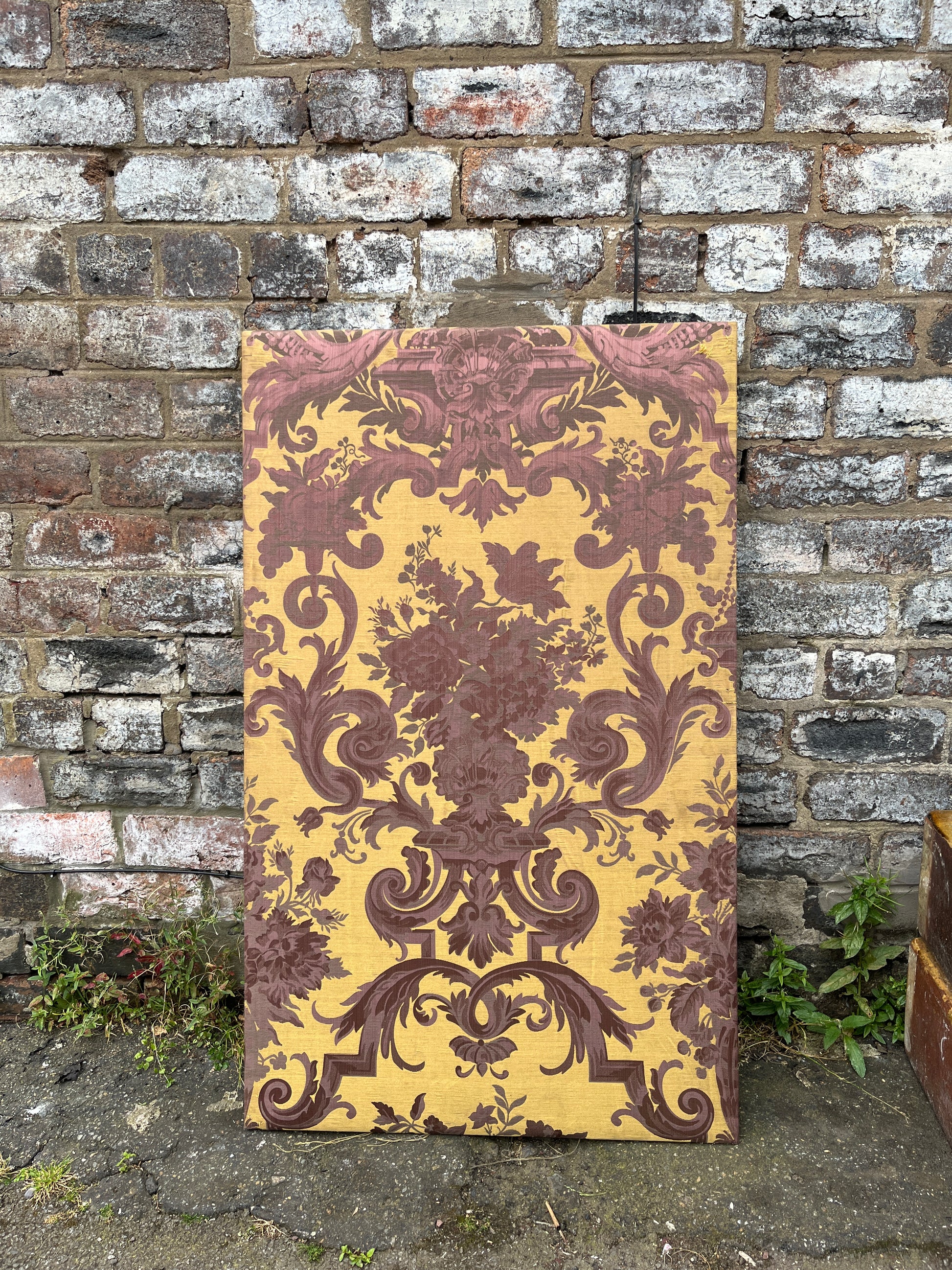 This tapestry panel, showcasing vibrant yellow and pink designs, comes from an authentic film set. It is mounted on a wooden frame and includes a cushioned fabric surface for a soft, tactile finish. Would be perfect as a headboard.