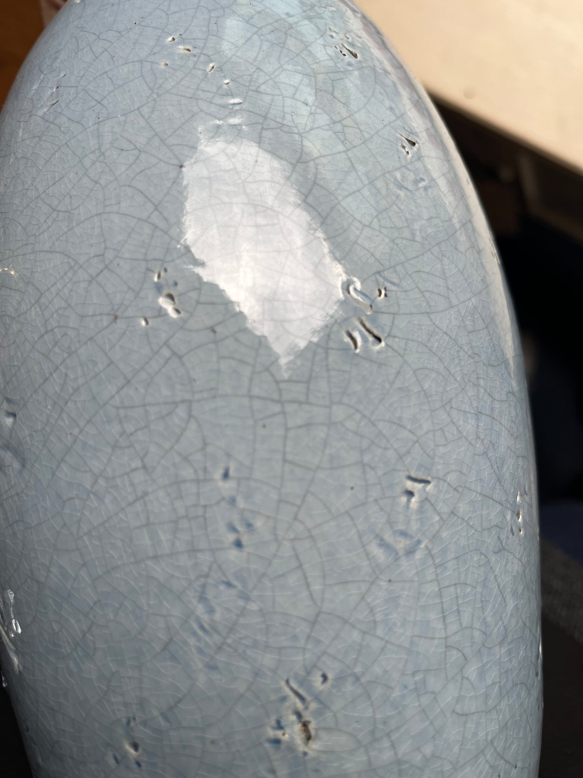 Authentic Portuguese vases in a sky blue hue. Featuring a beautifully glazed surface accented with textured dimples in the ceramic. One of the vases has a chipped rim.