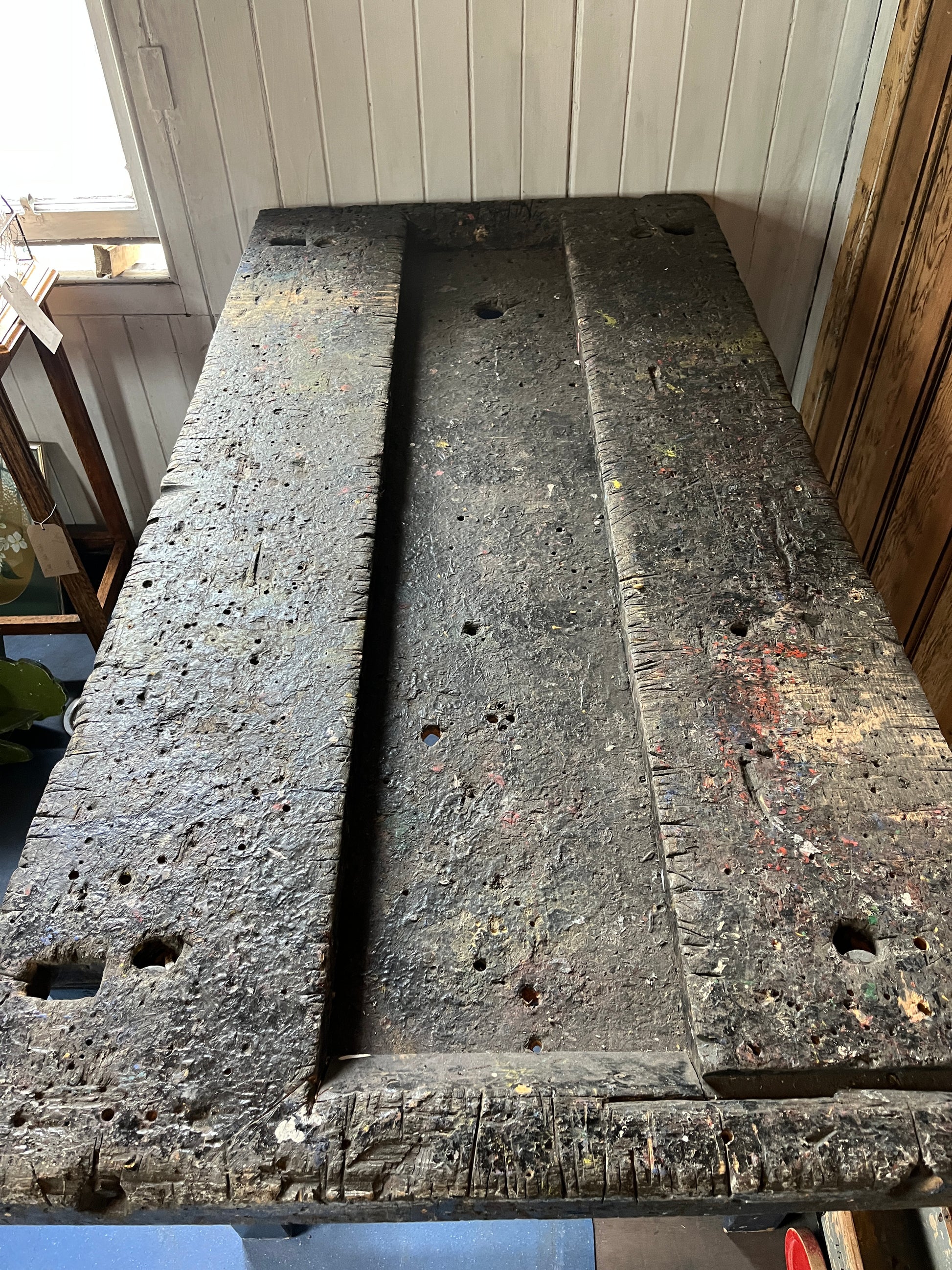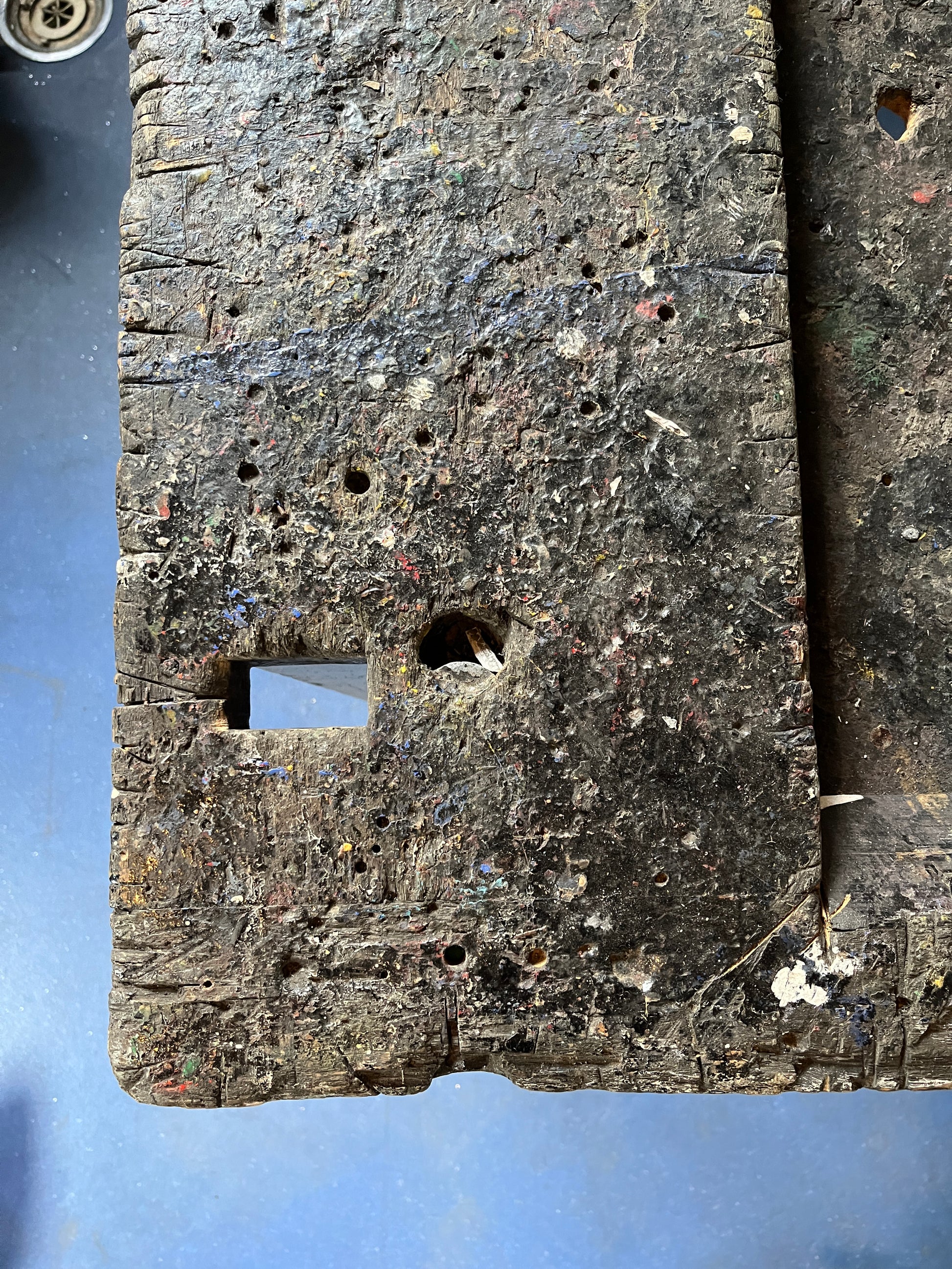 This artist's bench shows signs of extensive use, featuring a heavily paint-stained surface that adds unique character. It combines blue-painted legs with a wooden top.