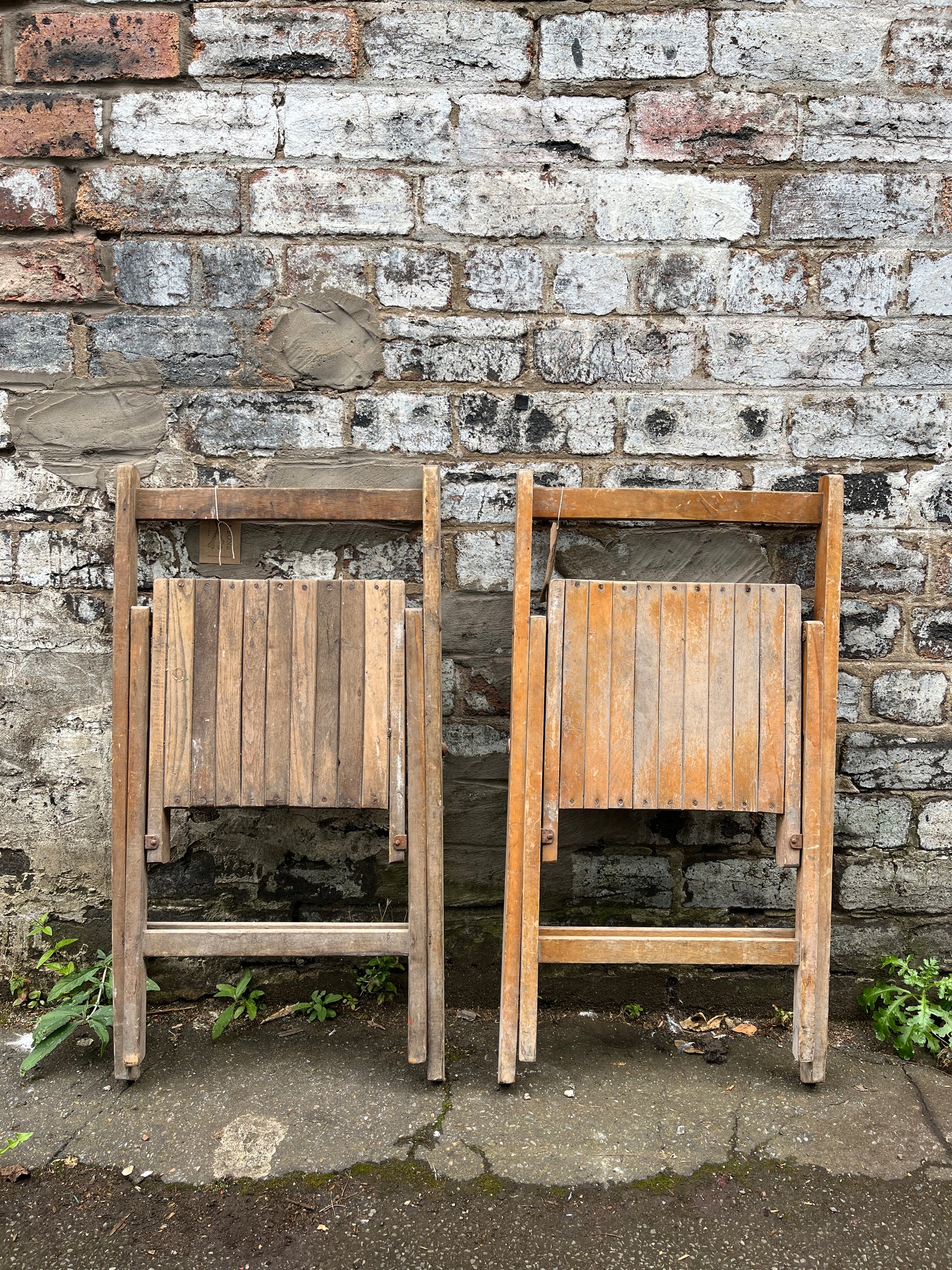 This pair of reclaimed wooden school folding chairs remains fully functional, featuring elegantly worn wood in two distinct tones.