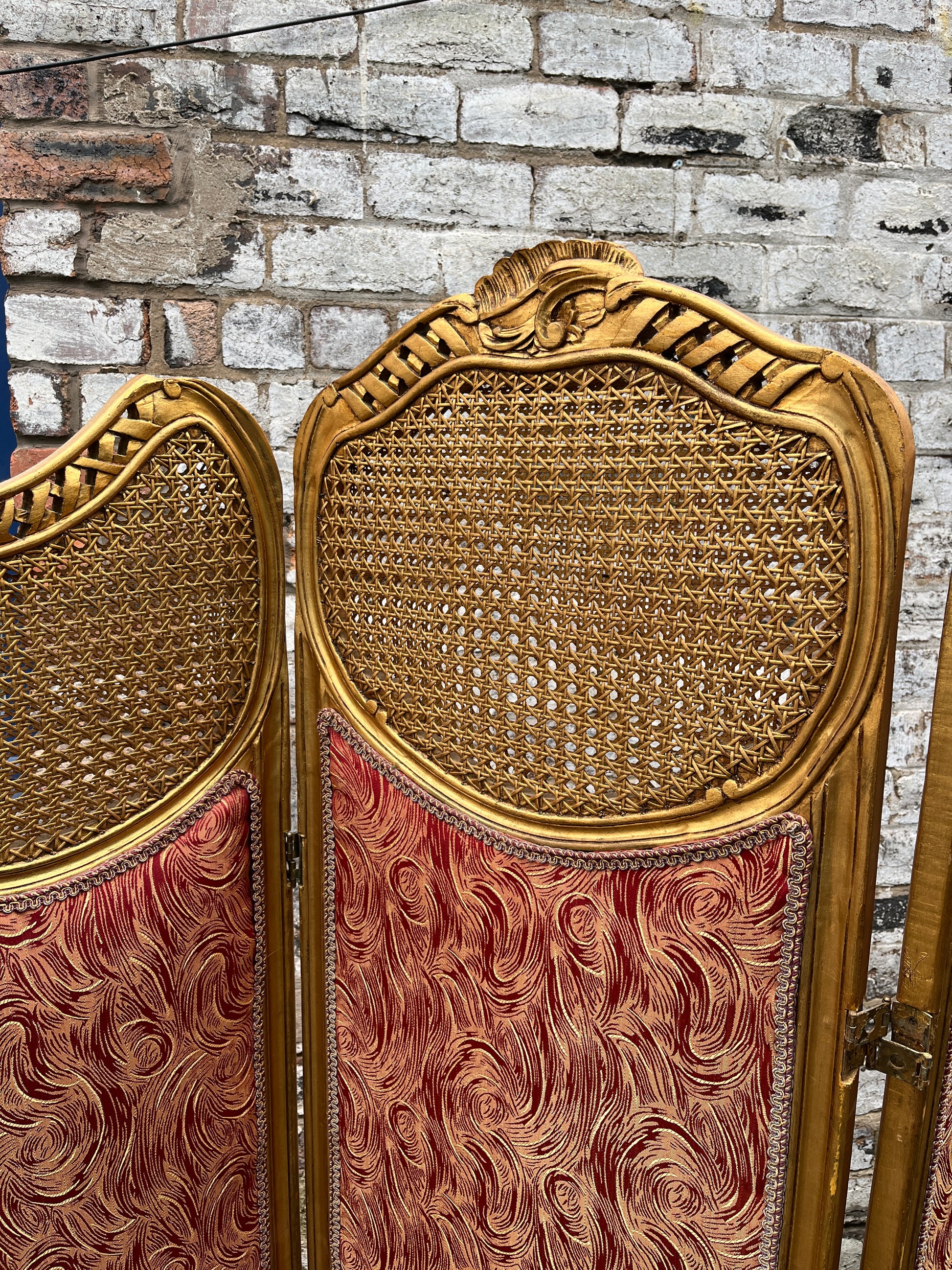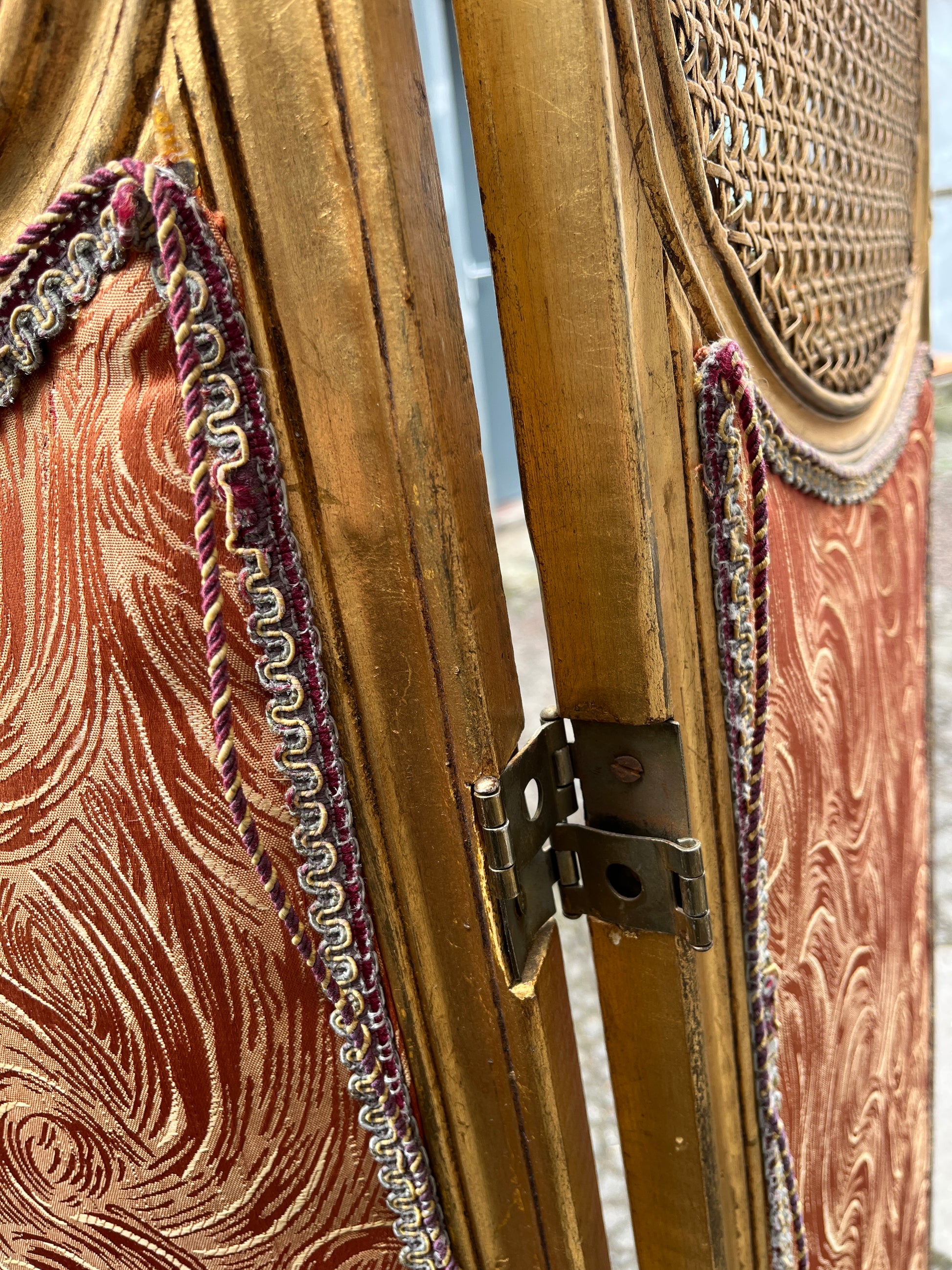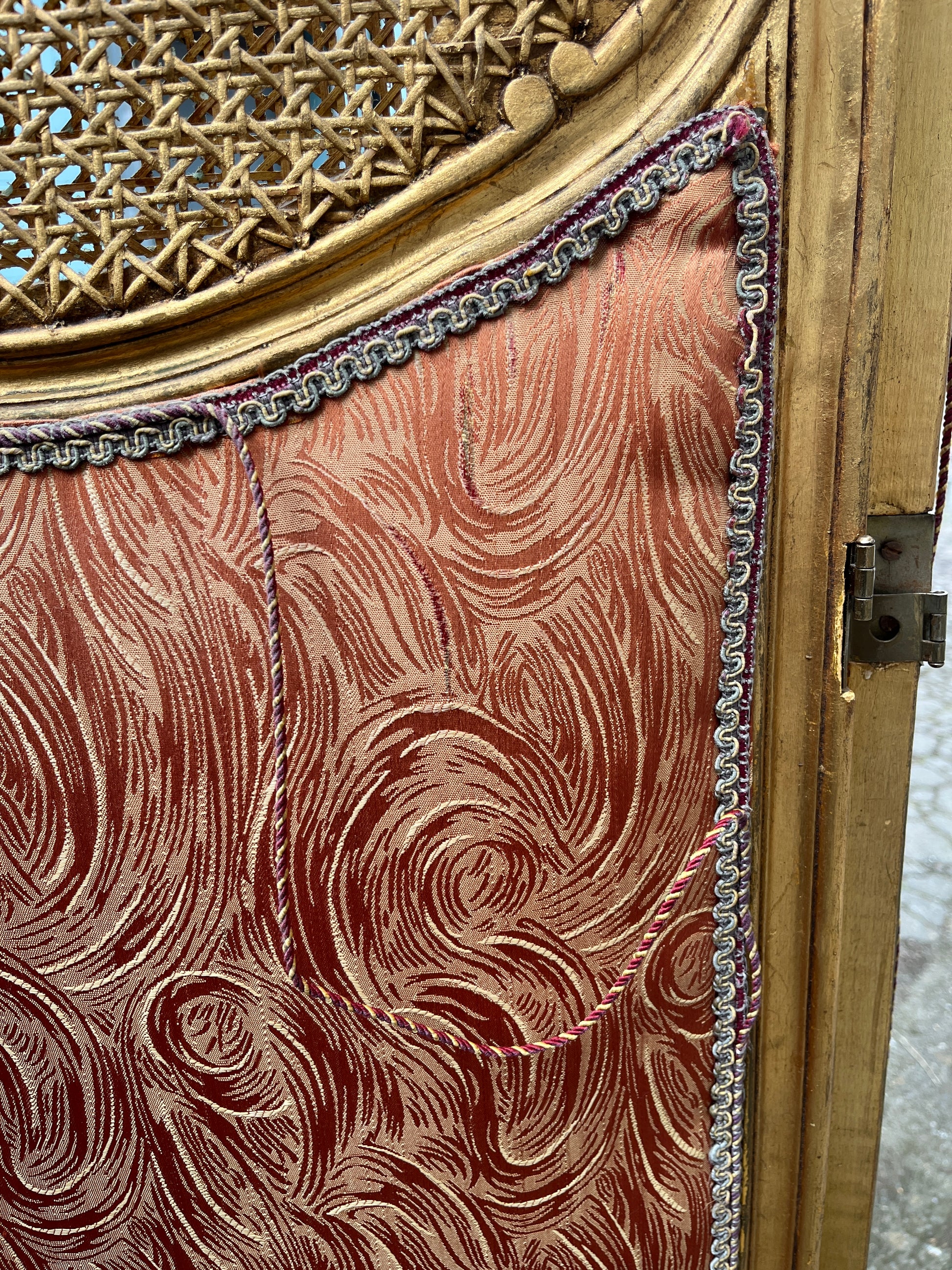 French Three Panel Screen Woven Straw Gold Decoration & Baroque Fabric 1890s