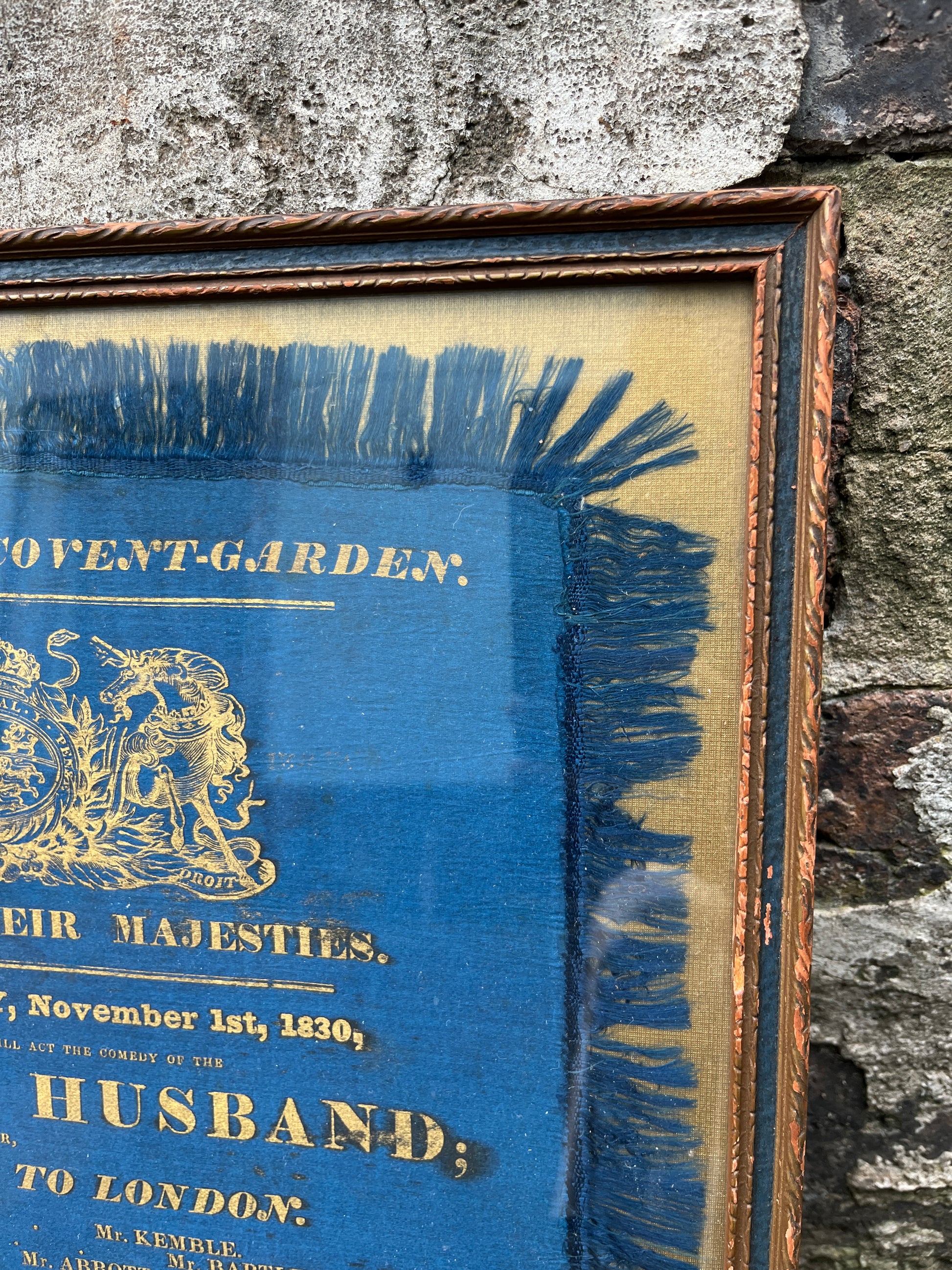 Playbill from Theatre Royal, "The Provoked Husband," a comedic play from 1728 by British playwright and actor Colley Cibber, draws its inspiration from a work by John Vanbrugh. Playbill is a beautiful vibrant blue with tasseled edges.