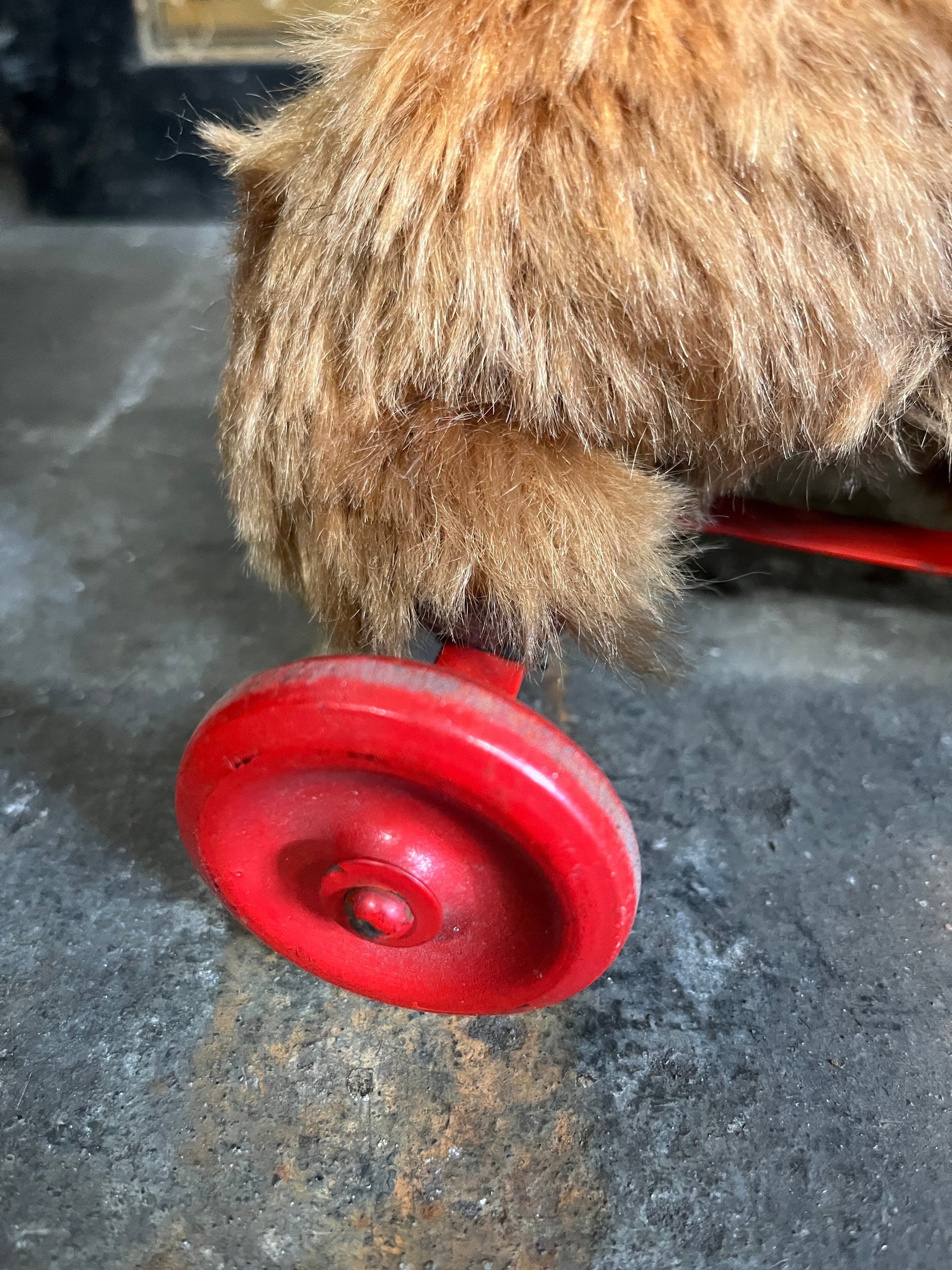This vintage terrier toy is equipped with a pull string and vibrant red wheels for pulling. It needs a bit of loving care to restore it to its former condition.