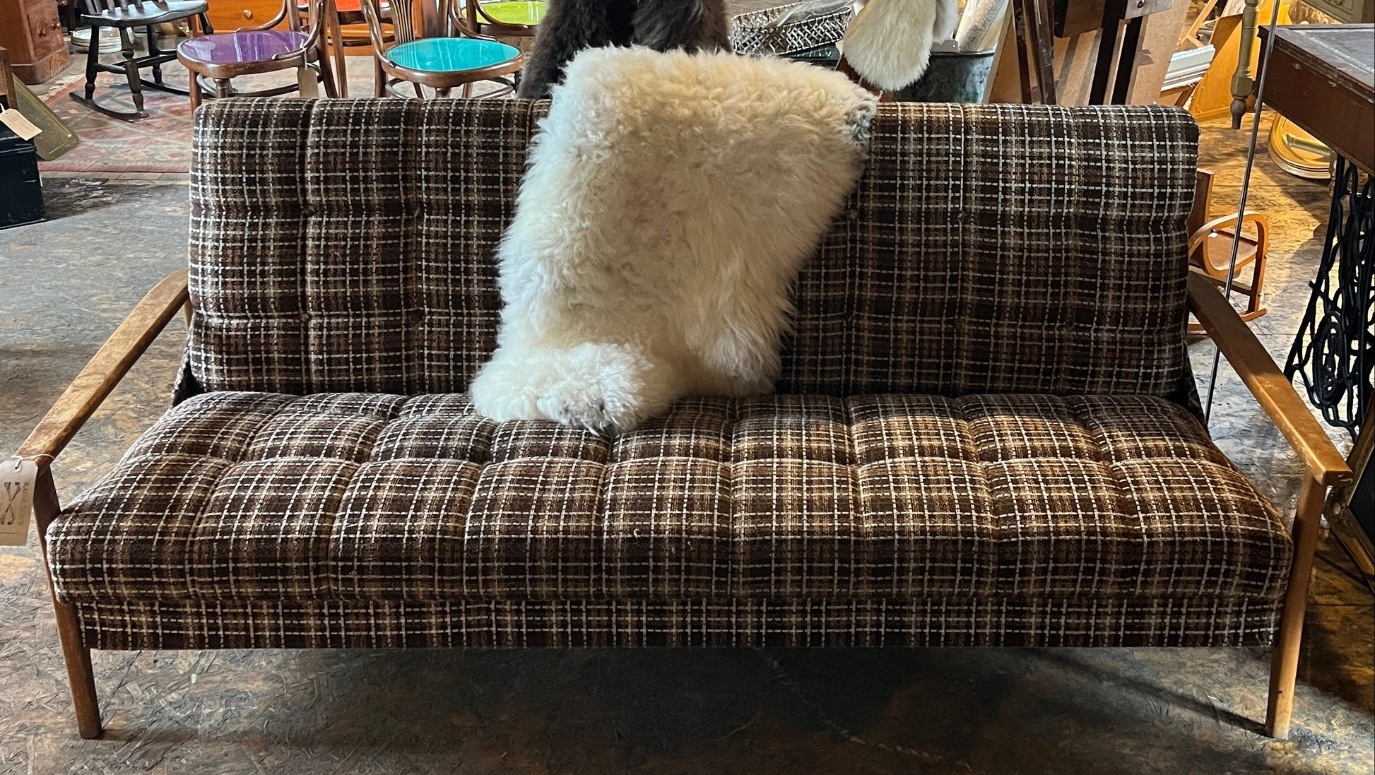 Crafted by the esteemed Wilhelm Knoll manufactory, this is an excellent example of a vintage Antimott daybed exemplifies post-war German design excellence. The piece showcases a sturdy cherry wood structure complemented by period-appropriate brown check wool upholstery, delivering the functional elegance and structural integrity that define this iconic modernist collection.